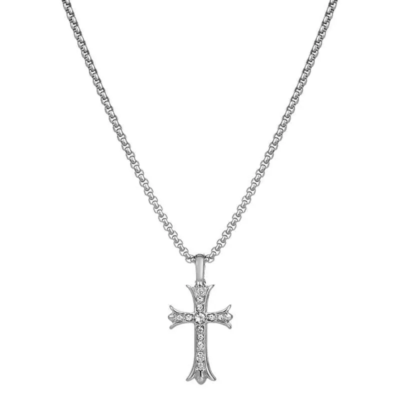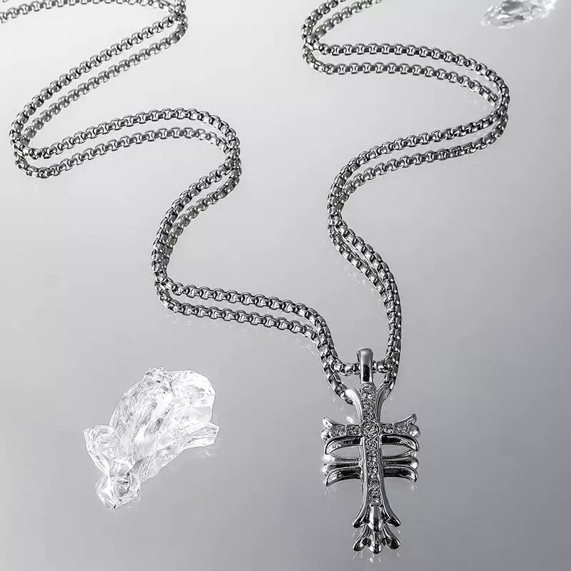 This is the ultimate Inner Compass. In a world of noise, the cool press of steel against the sternum is a moment of clarity. As the day unfolds, that initial chill absorbs your body heat, turning from armor into an extension of your own pulse. Light doesn’t just hit this piece; it dances along the zircon-studded edges, catching in the corners of your vision, a constant shimmer of Personal Sanctuary. It is designed for the woman who understands that true strength often borrows from the masculine to highlight the feminine. It is faith, redefined as resilience. It is heavy metal, worn with the lightest touch.